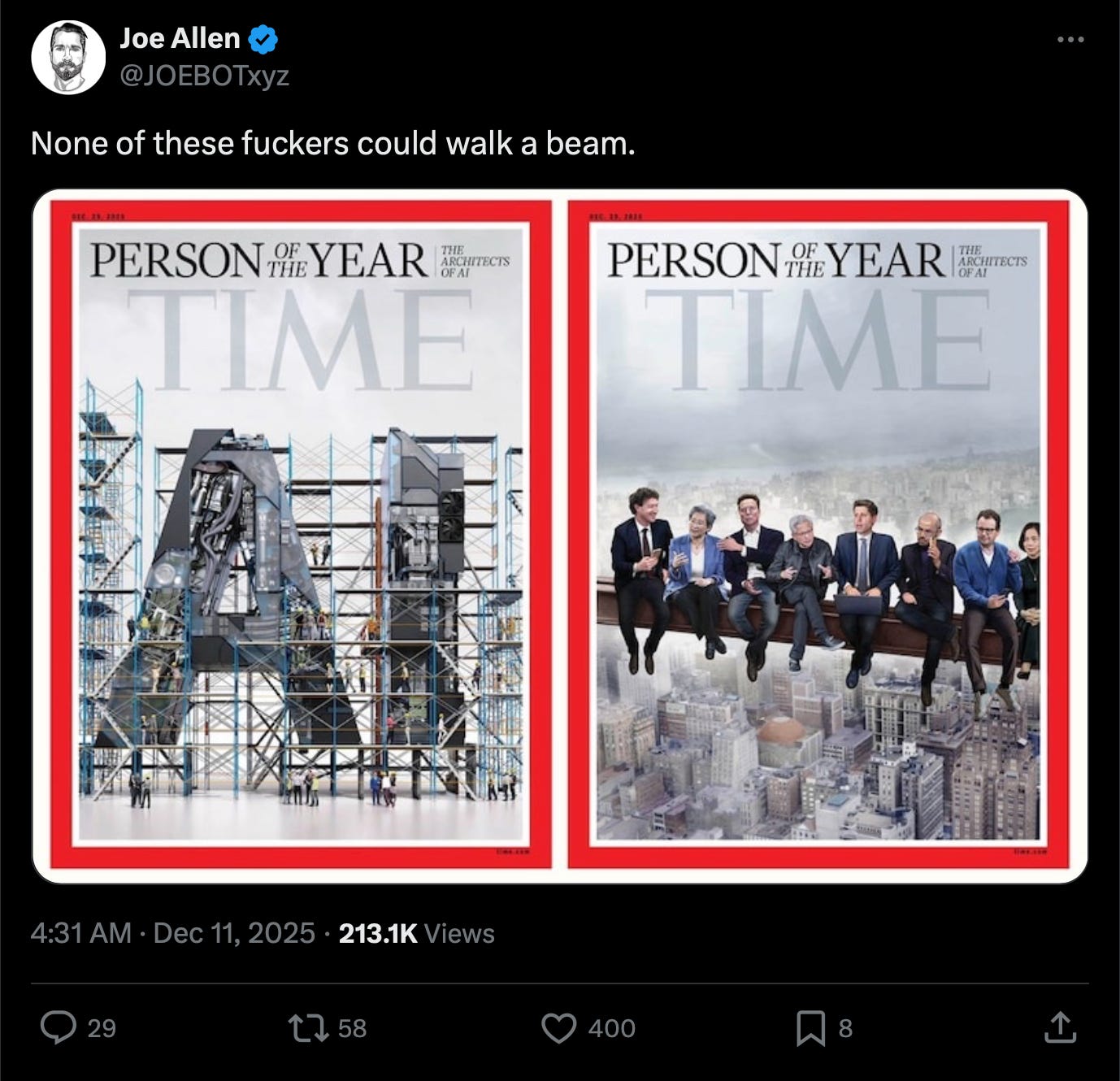 “Yeah, man,” I replied. “The one with the tech oligarchs sitting on a steel beam. It pissed me off!”